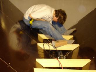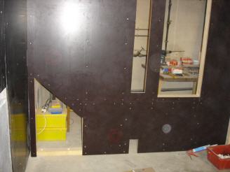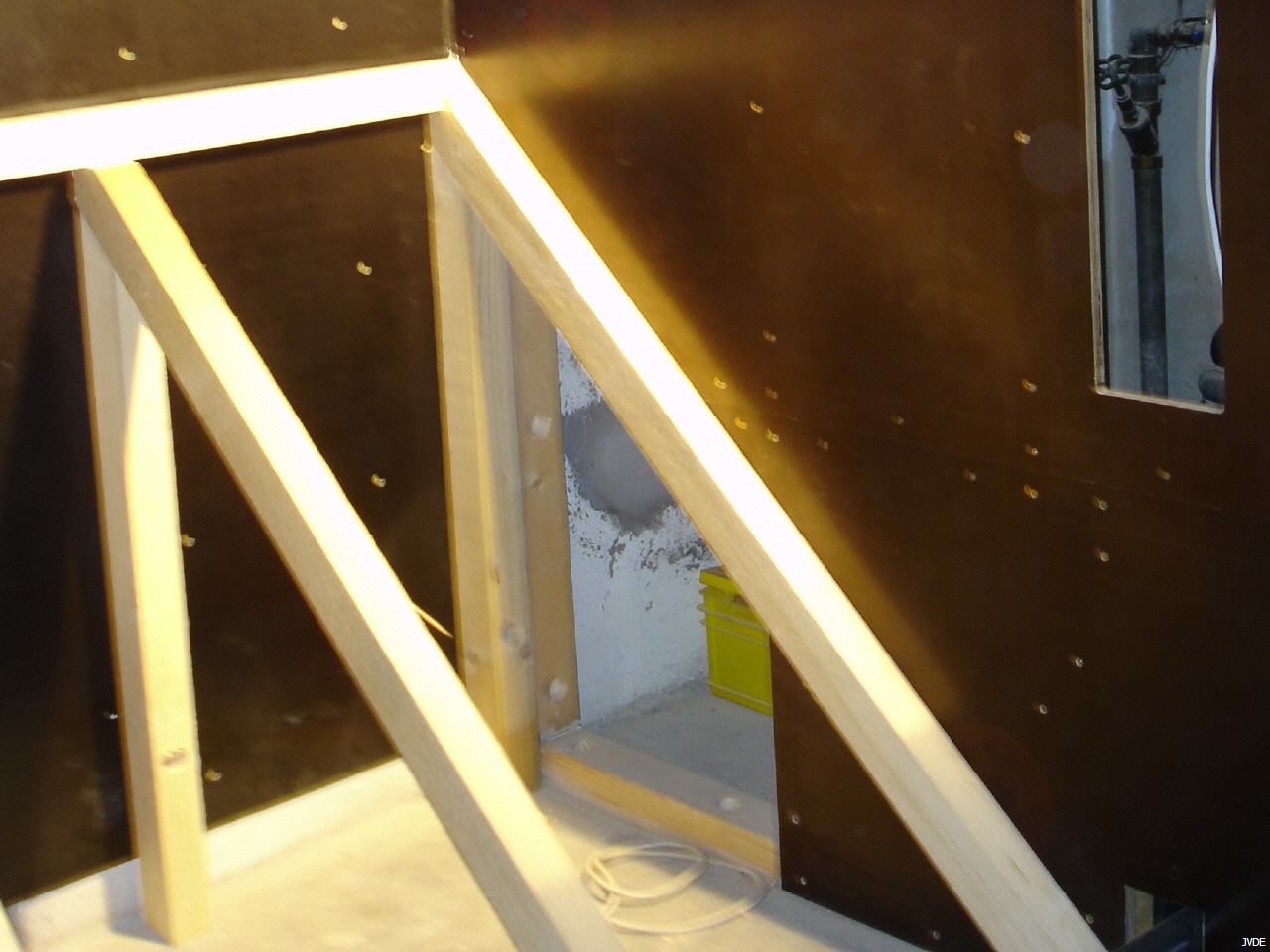 Die Innenbeplankung des Pelletsbunkers haben wir aus 19mm Filmplatten hergestellt. Die Schräge Öffnung ist der Zugang zu dem Abstellraum unter dem Schrägboden. |