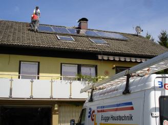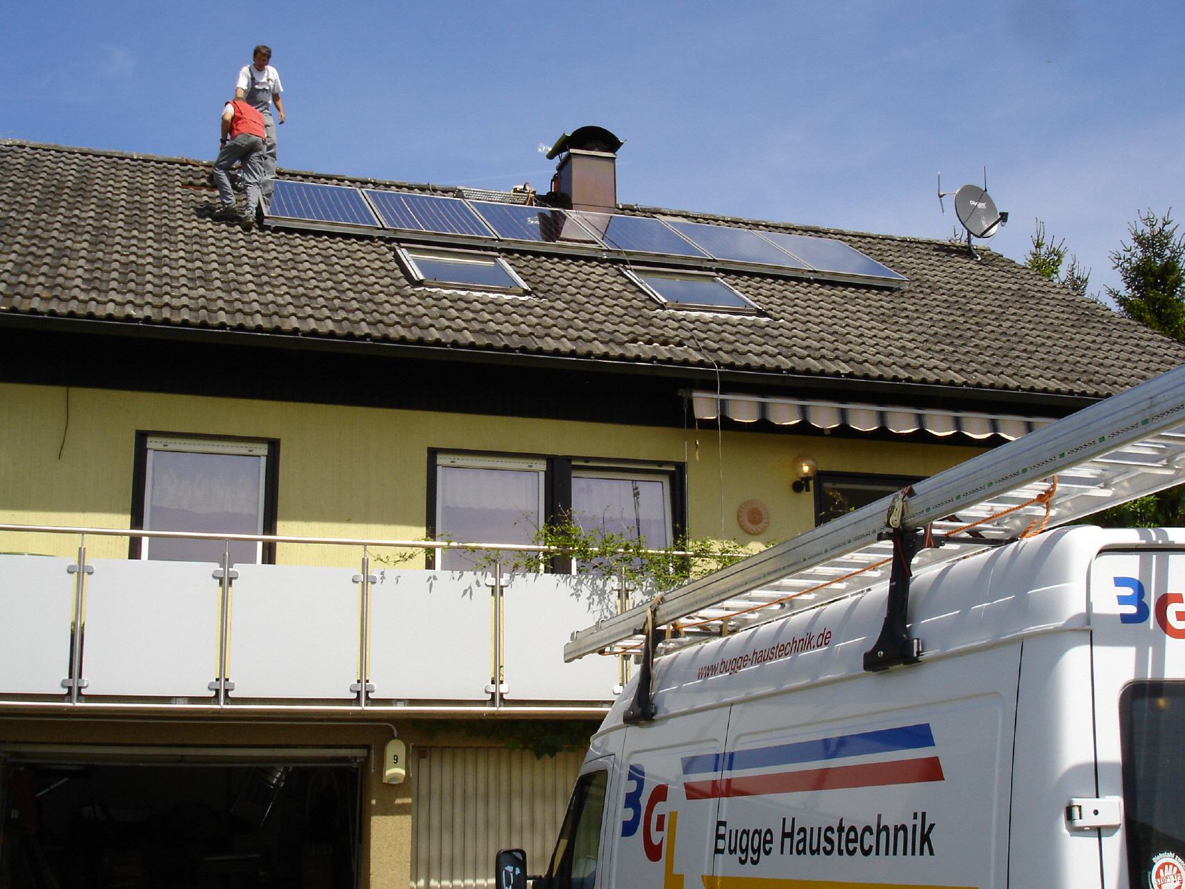 Montage der 6 Sonnenkollektoren mit total 16 m2 Fläche. |